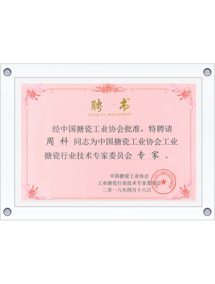 中國搪瓷工業(yè)協(xié)會(huì)專家聘書