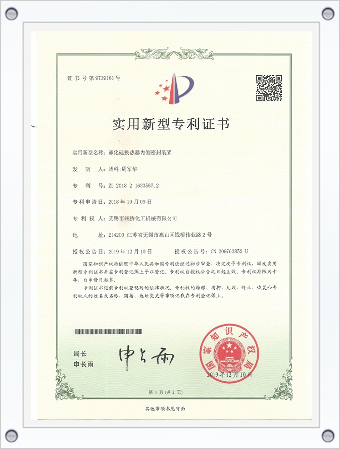碳化硅換熱器內(nèi)測(cè)密封裝置專利證書(shū)