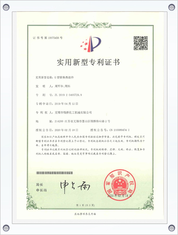 U型管換熱器專利證書