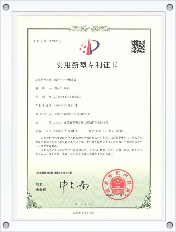 端蓋一字開槽裝置專利證書