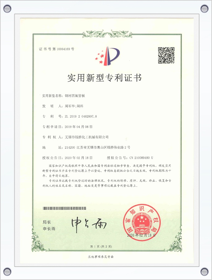鋼襯四氟管板專利證書