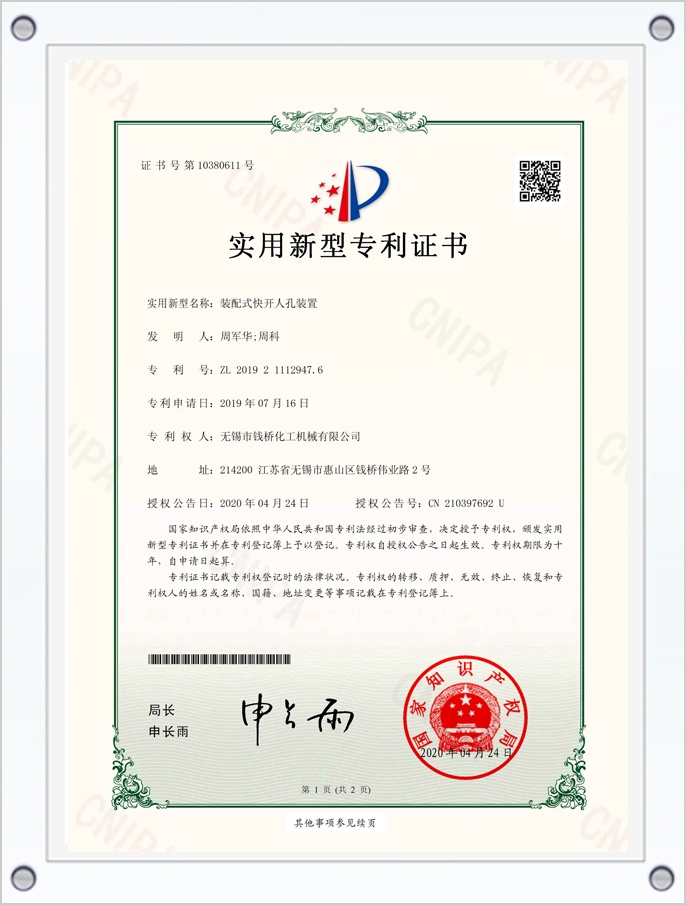 碳化硅換熱器內(nèi)測密封裝置專利證書
