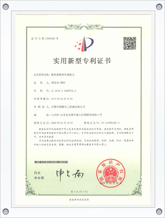 換熱器管體外圓磨頭專利證書