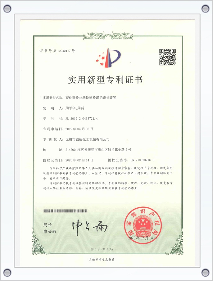 碳化硅換熱器管板密封裝置專利證書
