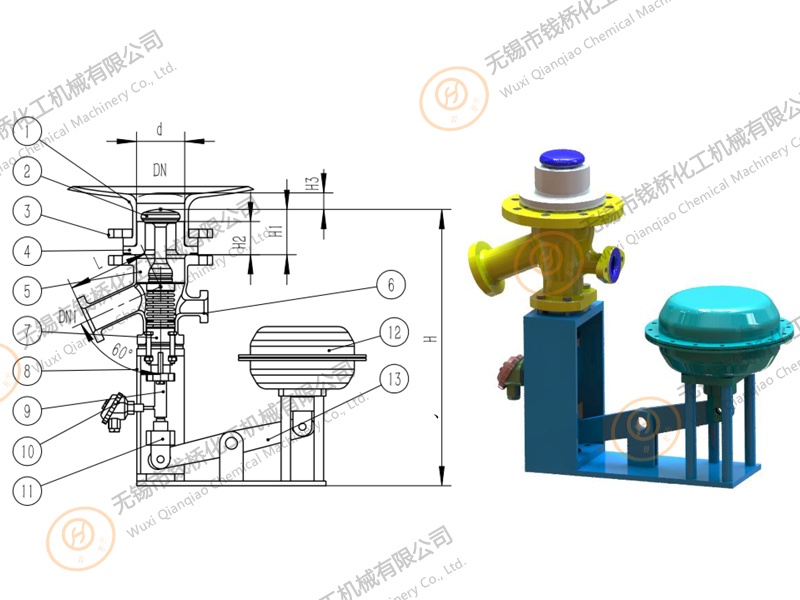 Bottom outlet valve (60°) gap free with pneumatic actuator(Side cylinder)搪玻璃上展式自動(dòng)放料閥(側(cè)向執(zhí)行機(jī)構(gòu)) *內(nèi)置測溫氣動(dòng)放料閥.The inorganic acid, organic acid, weak alkali solution and organic solvent are superior to stainless steel in strong corrosive media such as hydrochlor